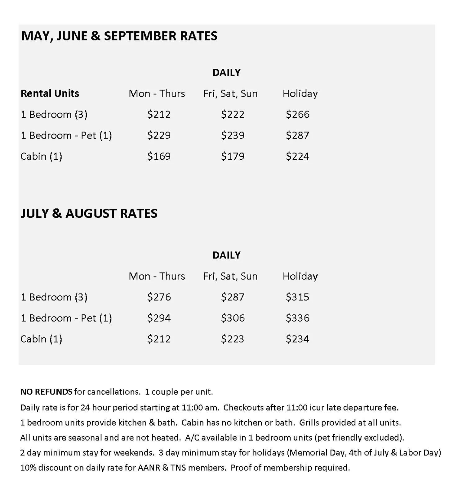 Sun Ridge has five beautifully appointed cabins for extended stays. Amenities include kitchen, bath, and private bedrooms.